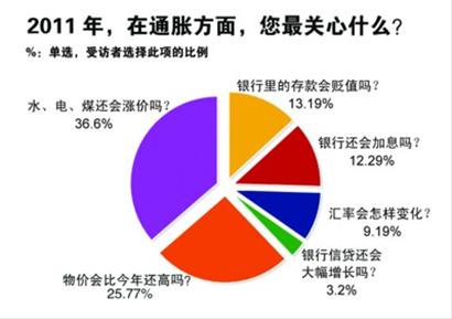 本次调查显示,受访者在面对“吃”的价格趋于平稳的状态下,依然对于物价表示担忧,其中:36.4%的受访者最关心的是生活成本如水、电、煤、气、油等是否还会继续涨价;25.8%的受访者担忧2011年的物价会不会比今年还高;有13.2%的受访者则有银行里的存款是否会贬值的疑虑;而12.3%的受访者最想知道的是银行明年是否会继续加息。 (见上表)