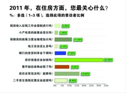 房价涨幅是否还会加快?有32.9%的受访者表示最关心这个问题;其次,16.6%的受访者提出房价还有泡沫吗,明年是否会降低的疑问;而11.5%的受访者则十分关注保障房和廉租房的政策力度在明年是否会继续加大;另外,如物业税、二手房交易税收政策、银行的房贷政策等问题也受到受访者普遍关注。 (见上表)