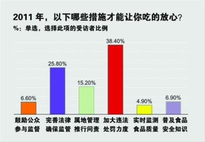 民以食为天,近年来频发的重大食品安全事件如“地沟油”、“化学火锅”、“三聚氰胺”等都让百姓对当今食品安全产生极大的担忧,怎样才能让老百姓吃得放心? 38.4%的受访者认为必须加大处罚力度,建立完整的食品安全监管体系;25.8%的受访者认为最重要的是先完善相关法律法规体系,确保监管有法可依。还有15.2%的受访者认为应该按照“属地管理”,严格执行问责制。 (见上表)