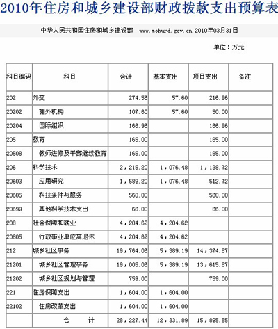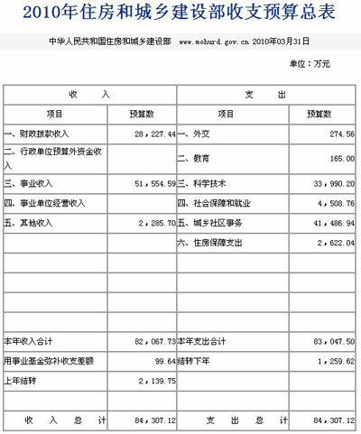 中新网3月31日电 住房和城乡建设部网站今日发布住房和城乡建设部部2010年部门预算表,其中包括2010年收支预算总表以及2010年财政拨款支出预算表。这是继国土资源部及财政部公开部门预算后,第三个公开预算的中央部委。