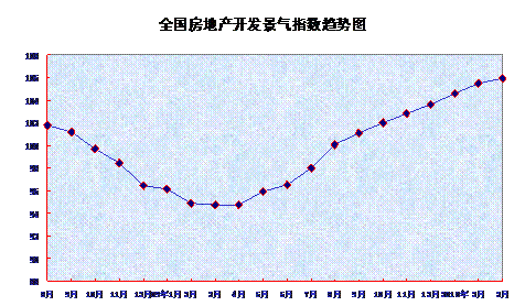 从分类指数看:房地产开发投资分类指数为103.58,比2月份提高1.76点,比去年同期提高11.58点;本年资金来源分类指数为119.67,比2月份持平,比去年同期提高25.96点;土地开发面积分类指数为87.07,比2月份回落1.32点,比去年同期回落5.13点;商品房空置面积分类指数为99.79,比2月份提高1.80点,比去年同期提高7.76点;房屋施工面积分类指数为112.04,比2月份提高2.74点,比去年同期提高18.54点。