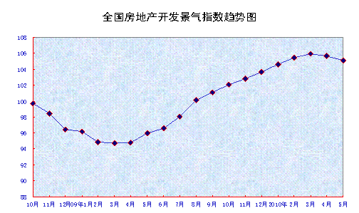 中新网6月10日电 据国家统计局网站消息,5月份,全国房地产开发景气指数(简称“国房景气指数”)为105.07,比4月份回落0.59点,比去年同期提高9.13点。