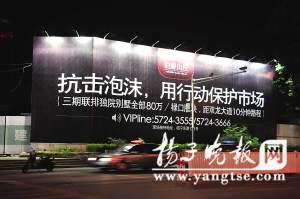 这家名为伯爵山庄的楼盘位于宁南禄口板块,记者在其位于洪武路上的一幅广告牌上看到,该楼盘打出的标语实在很“震撼”:“抗击泡沫,用行动保护市场”。一位路过的市民笑着说,“这家楼盘给自己戴的‘帽子’也太高了吧!”而对于广告上标榜的“别墅全部80万”的宣传语,不少市民表示,现在普通买房人买一套城区的公寓房都有点承担不起,谁会想到再去城郊买套别墅?“就算价格再低,恐怕也不会考虑的。”