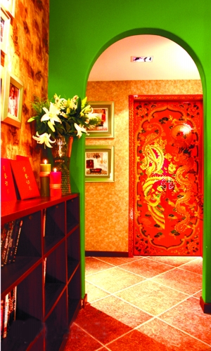 在这个案例中,绿色与红色成为整个空间中面积和色彩强度都非常均衡的颜色,对比强烈,两者的反差带给人的视觉效果也很震撼。绿色的墙壁非常抢眼,感觉也比较现代;但红色大门和大门上复杂的龙凤雕刻图案,在颜色和造型上都显示出混搭的奇异效果。