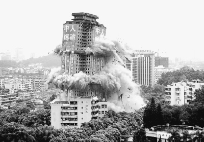 8月13日上午10时25分,随着3.6秒震耳欲聋的18声巨响,备受关注的广东省中山市山顶花园按照预先设计的线路应声倒下。