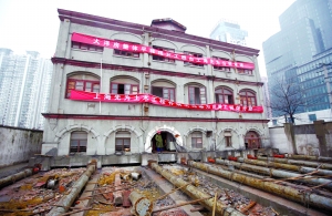 昨日,正在实施整体平移的上海浦东百年老洋房。近日,为配合世博配套工程浦东滨江大道建设,位于上海浦东新区东方路的一栋有着100多年历史的老洋房开始实施整体平移。这栋老洋房为四层砖木结构建筑,建于1906年。在平移工程中,千斤顶在计算机的控制下将使整栋大楼“行走”30多米,工程将于4月完工。新华社记者 裴鑫 摄