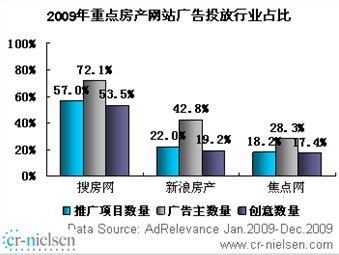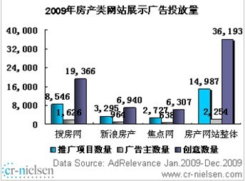 尼尔森《2009中国房地产网络广告市场研究项目报告》显示,2009年中国互联网房地产行业展示类广告推广项目总量为14987,广告主总量为2254,创意总量为36193,三项指标中搜房网分别占据了行业整体的57%、72%、53.5%。报告分析指出,房地产网络展示广告投放TOP3网站分别为搜房网、新浪房产和焦点网,除搜房网以较大优势领先外,新浪房产与焦点网的展示广告投放水平竞争胶着,新浪房产覆盖房产行业42.8%的广告主,焦点网约占三成,两家网站房地产展示推广项目数与创意数水平基本相当。