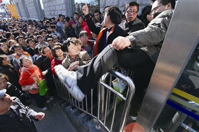 8时40分许,现场已聚集了上千人,民警和保安赶来维持秩序,工作人员正在商讨如何让大家安全地进入大厅,以免发生踩踏。
