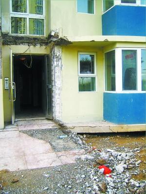 据媒体报道,继上海的“楼脆脆”后,京版“楼脆脆”也已现身——清河莱镇香格里小区的11号楼门厅下陷,墙上破了两个大洞,引起小区业主的担忧和恐慌。今天上午记者在莱镇小区的现场看到,塌陷的门厅已经被拆卸。