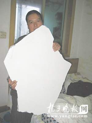 记者在老汉家中看到,老汉房内一片狼藉,全是屋顶掉下来的水泥碎块,最大的超过脸盆大小。而屋顶上至少有5平方米区域内的水泥几乎掉光,老人床头依然血迹斑斑。事发后,老汉的儿女来到房屋开发商扬州美林公司,要求“给个说法”。她希望房产公司能够把公公的伤治好,同时把屋顶的残破水泥块敲掉,重新做一下屋顶。