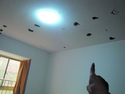 12月7日中午,在物业公司服务的王小姐走进租住的岳麓区西岸润泽府小区6栋307房,立即发出一声尖叫,她发现自己本来干净整洁的床铺上散落着大大小小的水泥块,而本来光洁白亮的天花板出现了几十个洞。“当时第一感觉以为是发生了地震。细数发现,竟有29个洞。”合租的一男孩子告诉记者。后来大家明白了,这是楼上装修引起的问题。