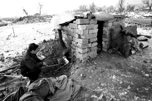 昨日中午,青砖窝棚在废墟的白雪包围下,冒起炊烟,崔存玲在一个缸子里烤起馒头,准备着和丈夫的午饭。