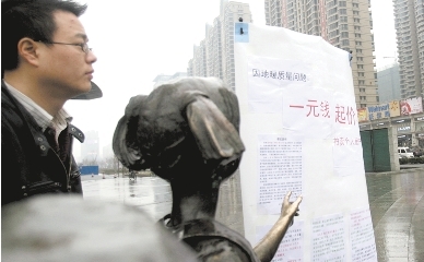 昨日10时,在金水路与未来路交叉口,一男子拿着一个上写“因地暖质量问题,一元钱拍卖个人房产”字样的牌子站在雨中,引来不少市民观看。
