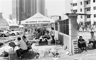 近日,在刚刚收房不久的常营两限房富力阳光花园小区门口,数十家装修公司聚集在路边,搭起帐篷“门脸房”做生意。
