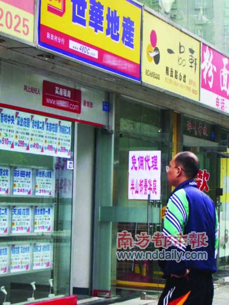 刚看到世华地产彩田村分行门口“免佣代理半山御景华庭”的告示时,记者还以为是二手楼,因为只有买二手房才需要付给中介公司佣金。采访之后才知道,原来“免佣”的说法是相对中介公司而言的。“一般来说,在中介公司放盘的都是二手房,交易达成后中介向卖方双方各自收取房款1.5%的佣金,而现在我们这里放盘的半山御景华庭是一手新楼,我们作为中介代理方带客户过去购买,对买家是不收取任何中介费用的,而是开发商给予我们佣金提成。”该店铺经纪人陆先生解释道。