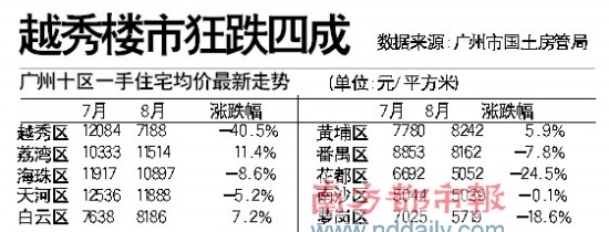 广州越秀区房价大跳水,一手住宅均价从今年7月的12084元/平方米猛跌至7188元/平方米。广州市国土房管局调查指出,越秀区房价大幅下降是由两个低价楼盘的集中交易造成的,专家称可能涉及内部交易。而广州市日前公布的最新房地产市场分析报告显示,广州全市十区8月一手住宅均价小幅下降至9078元/平方米。