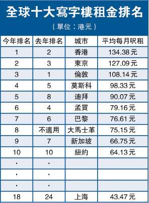 报告显示,香港核心区域写字楼平均尺租为134.38港元。另外,报告还显示,上海以43.47港元的尺租排名第十八位。