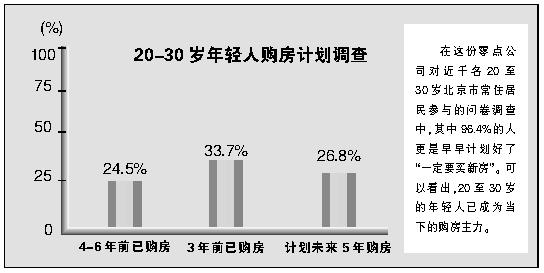 据千万家调查数据显示,2006年12月至2007年2月,京城毕业3年内的年轻人租房需求占租赁总比例的38%,与上年同期的46%相比下降8%。调查发现,其中多数人开始在父母的帮助下提前购房。