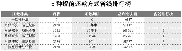 目前,银行提供的提前还款方式基本有5种,即一次性还清;月供不变,缩短还款年限;减少月供,还款期不变;减少月供,缩短还款期限和增加月供,缩短还款期限。而这5种提前还贷方式究竟哪一种最经济省钱呢?为此,我们专门请教了北京中原地产三级市场研究部的专业人士,用案例为您做纵向比较。