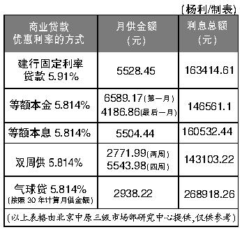 据伟嘉安捷顾问介绍,“气球贷”为房贷消费者设定了3年、5年和10年三种贷款期限,但在计算月供和利息时则可以选择更长的还款期限,如10年、20年和30年,这样可以在贷款期限内降低月供数额,而贷款期满后则要将剩余大部分本金一次性还给银行。针对银行近年来推出的几种购房还款方式,专业人士以“贷款额为50万元,贷款期限为10年”为条件给记者算了笔账: