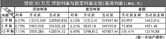 比如,目前光大银行固定贷款利率仍然执行3年期以下基准利率为6.12%,3-5年期(含)基准利率为6.21%,5-10年期(含)基准利率为6.45%,而加息后目前最新贷款基准利率分别为6.57%、6.75%和7.11%。(以贷款30万元为例,选择浮动利率和固定利率的月还款额对比情况)(见附表)。