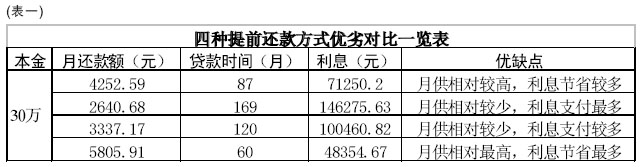 方式一,部分提前还款,剩余的贷款保持每月还款额不变,将还款期限缩短。如此算来,30万元贷款需照旧每月还款4252.59元,需要大概七年零三个月左右的时间。利息共计71250.20元。
