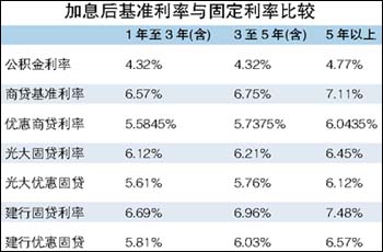 3月18日,央行上调金融机构人民币存贷款基准利率,其中5年期以上贷款利率由6.84%调整为7.11%。随后,建设部也宣布将公积金贷款利率提高0.18个百分点。就在公积金和商业贷款利率上调后的第三天,最早在北京市场推出固定利率贷款的光大银行也将1年至3年(含)固定利率房贷的优惠利率由5.52%调升为5.61%,3年至5年(含)优惠利率由5.73%调升为5.76%。