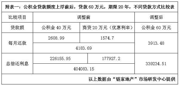 金育松说,通过表格对比可以看出,公积金贷款额度调高以后,60万元可全部使用公积金贷款,每月还款额比调整前的组合贷款少还270.21元,总偿还利息可节省64848.64元。另外,办理组合贷款比单纯办理公积金贷款手续更多、需时更长、手续费更多,部分购房者甚至因为组合贷款太繁琐转而全部采用商贷,而此次公积金上浮最高额度后,部分购房者可直接选用公积金贷款,既省钱又省时省心。