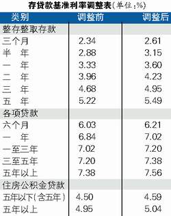 中国人民银行昨晚宣布,自今天起上调金融机构人民币存贷款基准利率。这是央行继3月18日、5月19日、7月21日三度加息后,本年内第4次加息。根据决定,金融机构一年期存款基准利率上调0.27个百分点,由现行的3.33%提高到3.60%;一年期贷款基准利率上调0.18个百分点,由现行的6.84%提高到7.02%;其他各档次存贷款基准利率也相应调整。个人住房公积金贷款利率相应上调0.09个百分点。