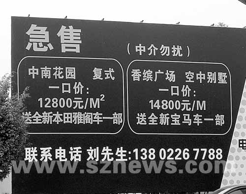 最大的一块广告牌矗立在白石路与科苑南路交汇处的西南侧,约10平方米大小,黑白分明的底色,端端正正的橙色粗体字格外引人注目。“急售”字样下有两个椭圆形框,框内写明了具体出售内容,一个是“中南花园,复式,一口价:12800元/平方米,送全新本田雅阁车一辆”,另一个是“香缤广场,空中花园,一口价:14800元/平方米,送全新宝马车一部”。广告牌下端还留下了业主刘先生的手机号码,并特别注明“中介勿扰”。