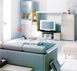人们在选择主题家具为居室增加亮点时,首先考虑的是沙发,所以在扩大客厅空间时,沙发就成为整个空间的焦点。小客厅的设计注重的是实用,不必太过追求外观的华丽或花哨,因而一些现代、简约风格的沙发,尤其是一些组合式沙发,不仅占地少而且功能齐全,较适合屋主充分利用空间收纳物品的需要。在客厅里看电视,常常会手捧一本杂志,或沏一杯清茶悠闲地放松身心,这时如果选用的是组合式沙发,那么你想要的书籍、报章、CD等小物品,就可以随手塞在沙发内嵌的小抽屉里了;如果累了,还可以在床一样的沙发上休息片刻呢。现在流行的DIY组合柜更可以任意调节柜子的高度和宽度来满足不同的置物需求。