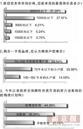 调查参与者中,超过七成人数认为北京房价在2007年仍然会是上涨趋势,而认为政府在保障性住房方面还不够努力,选择“不能让人满意”的接受调查者占到了82.28%,加上肯定了政府努力但怀疑最终效果的近一成比例调查参与者,有约97%的调查参与者对政府在保障性住房方面的努力持批评、怀疑态度。北京市政府从4月开始加大了对限价地推出的力度,但要转化为保障性住房至少还需要1年时间。这也使得调查中超过六成参与者选择了犹豫或者直接推迟购房计划。