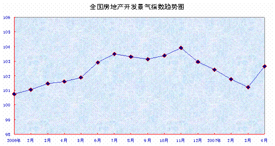 房地产开发投资分类指数为102.17,比3月份上升0.70点,同比上升2.04点。1-4月份,全国完成房地产开发投资5265亿元,同比增长27.4%。完成商品住宅投资3658亿元,增长29%。其中,经济适用住房投资149亿元,增长48.5%。