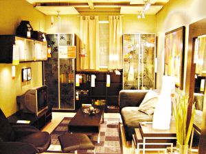 客厅的家具不宜太复杂,比如可以选用单排的沙发,再配上几个可移动的小脚凳等,比较随意而实用。客厅的茶几可以使用玻璃面的,通透的感觉会让茶几占用的空间显得相对小些,而且不会感觉笨重。客厅不大电视墙就无须复杂,可以选用壁挂式的超薄电视,电视旁边如果不够地方做厅柜,甚至可以在电视上方做一些小隔板用来摆放装饰品。