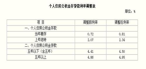 一、从2007年7月21日起,当年归集的个人住房公积金存款利率由现行的0.72%调整为0.81%,上年结转的个人住房公积金存款利率由现行的2.07%调整为2.34%。