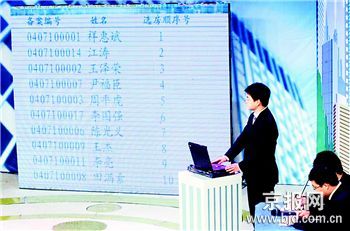 早7时,40户陶然亭街道的居民代表就已等在电视台门口,大家表情都很兴奋,并互相祝邻居能摇到一个好号。上午9时,北京电视台演播大厅现场的气氛竟然有些紧张。居民代表们紧紧盯着电脑上的号码,希望自己能成为“幸运儿”。经过6轮的摇号,219户符合标准的住户中有17户居民获得廉租房房源,190户居民获得经济适用房房源,17户廉租房中签率是100%,82户经适房困难户中签率100%,余下的经济适用房中签率为90%。