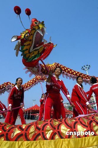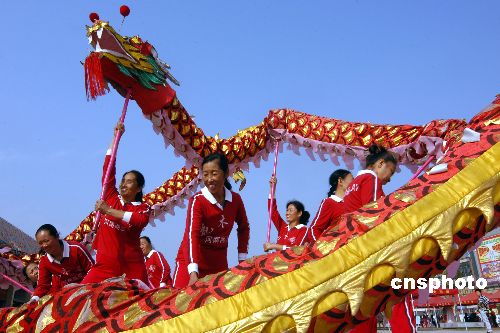 2007年10月20日,在安徽省亳州市万福广场,一支女子舞龙队的队员正在进行舞龙表演,为在这里举行的为期两天的亳州市首届“万福”老人节助兴。中新社发 张延林 摄