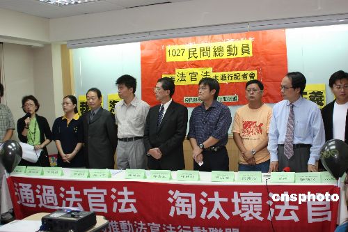 台湾“民间推动法官法行动联盟”十月二十五日召开记者会宣布,将于十月二十七日在台北中正纪念堂前广场发动“我要法官法”大游行。组织者说,很多人进法院是要追求公平正义,但却因不良的法官,受到再次伤害,法官法法案中最重要的就是法官的淘汰机制。在台湾, 法官法已推动十几年,至今尚未通过。中新社发 耿军 摄