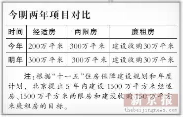 明年北京将建设300万平方米经适房、300万平方米两限房并建设收购30万平方米廉租房。其中,经适房开工面积比今年增加了100万平方米。昨日,位于朝阳区的常营经适房、常营两限房项目同时开工,至此北京今年的保障住房和两限房的开工指标全部完成。
