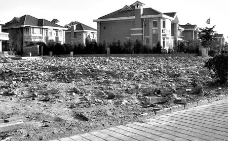 一片瓦砾、红砖碎片,角落里并肩躺着4个抽水马桶,旁边堆着200多块路牙石,曾经小区里惟一联排的别墅荡然无存,与周围红墙蓝瓦的整体风貌格格不入。2月22日,记者获准在北京国际花园看到的这片废墟,“造价”超过千万。