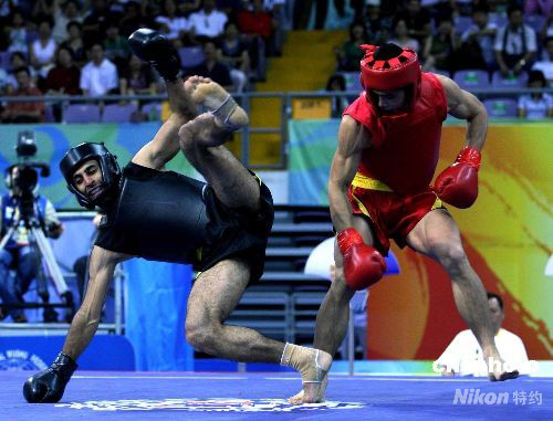 8月23日下午,在北京2008 武术比赛男子70公斤级散手赛中,红方中国澳门选手蔡良蝉胜黑方埃及选手艾哈迈德.艾哈迈德.易卜拉欣。中新社发 宋吉河 摄