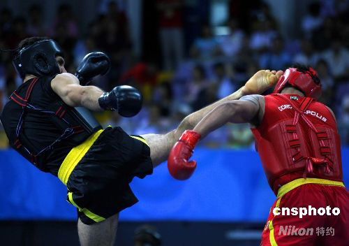 8月23日下午,在北京2008武术比赛男子散手70公斤级较量中,伊朗选手侯赛因·奥贾吉(黑方)战胜巴西选手埃默松·诺盖拉·阿尔梅达(红方)。中新社发 宋吉河 摄