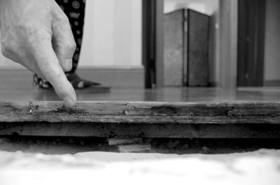 “距我们反映主卫门框下面渗水、造成主卧的地板部分褪色、门框底框腐烂、门套底部贴面有气泡突起、地砖大面积发黄这些问题已经一个月了。有人来看过也说是‘防水没做好’,但没单位负起这个责,彻底解决这件事,只是互相推诿。作为弱势群体的我们只能不停地反映、等待。现在被挖开的地方,每天都会有小虫爬出来。哎,花600多万买的房子,浴缸却只能看不能用。 ”陈老先生的老伴边说边指着旁边畚箕里她扫出来的黑色小虫子。对此,物业部门也派人检查了好几次。