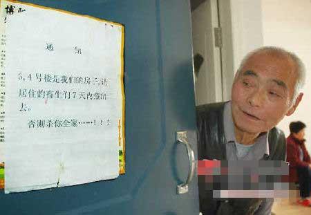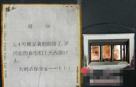 该小区物业办工作人员说,十天前,小区里突然出现了十几张通知,落款未写单位,但内容很恐怖:如果三、四号楼的住户不搬家,就杀他全家。“整个小区的人都人心惶惶的,特别是三、四号楼的200多个住户,日夜守在家里,生怕没人的时候房子被人强占。”该工作人员说。