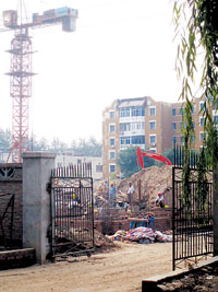 昨日,本报5版报道了规划部门在通州发现百万平方米的小产权房(见上图)。消息见报后,有读者致电本报称,通州区宋庄镇白庙新村正在兴建小产权房。15点30分左右,记者来到位于白庙新村南侧的施工地点,在离工地数百米远的地方就可以看见两架高高的塔吊正在紧张施工当中。走近工地围墙,记者发现,围墙及大门附近都未看到施工单位的任何相关信息。记者从大门向里望去,上百名头戴安全帽的施工者正在紧张忙碌着,三四米高的土堆下面,两栋楼房的地基正在垒建当中,四周凌乱地摆放着木板砖石。