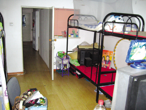 记者跟随他们来到小南庄26号楼的一间半地下室,这个房子已看不出“两室一厅”的格局,其中的厅被木板隔成了一间约4平方米的房子,进门右手边是一条长约3米宽一米的过道,尽头是已住满了8个女生的房间。准备出租的是左手边“建筑面积12平方米”的小间,里面放了一个衣柜和两个上下铺。上铺月租260元,下铺月租240元。房东表示,如果一次交齐半年或以上租金,月租还可以便宜20元钱。