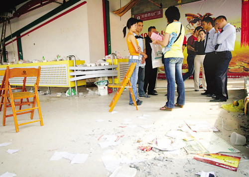 22日下午3时,在“金盛财富广场”售楼部内,有四五名业主与开发商方争吵着,地面有很多被撕成碎片的文件。在售楼部外,一帮业主也在议论纷纷,有数十名保安在维持现场秩序,路边停着一辆警车。
