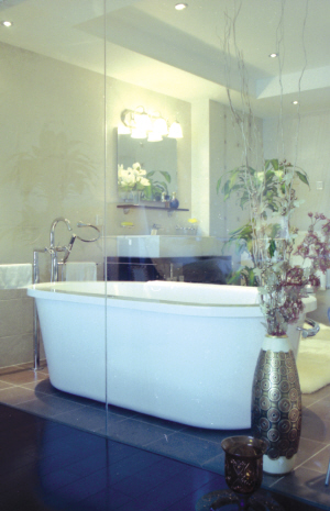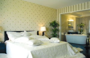 卧室的舒适不言自明,壁纸的颜色温馨柔和,深浅相间,赋予空间别致的特色。纯白的床饰、纯白的羊毛地毯、米色的窗帘组合起来,给人以无限遐想,流连其间韵味十足。