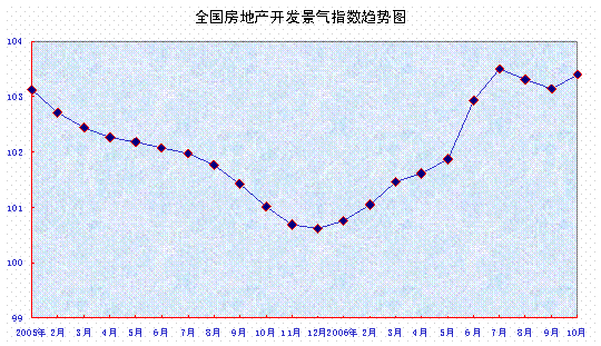 中新网11月17日电 国家统计局网站今日公布的数据显示,10月份,“国房景气指数”为103.40,比9月份上升0.26点,比去年同月上升2.38点。