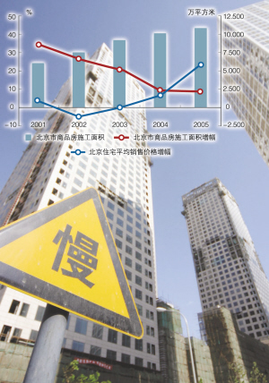 而房地产投资放缓后的2004、2005和2006年,商品房施工面积⒖⒐っ婊拖勖婊脑龇宦废禄?006年出现了负增长。与此同时,房价却在一路上扬。根据中国人民银行营业管理部货币政策分析小组所做的“2004—2005北京市金融运行报告”,2004年,北京住宅平均价格增幅为6.7%,2005年增幅达到了19.2%,而2006年,涨幅也超过了10%。